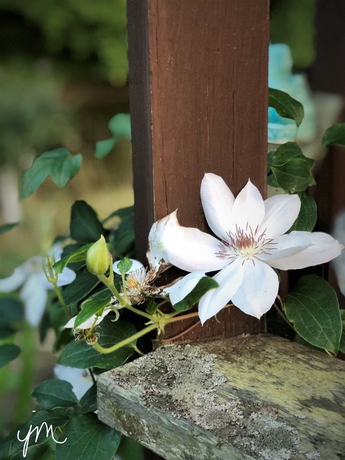 I took this photo at a beautiful outdoor wedding reception I attended this past weekend. This vining white clematis seemed so symbolic of the blossoming love of a new marriage.  It also made me think about the blossoming love I have for my newest granddaughter – only a few weeks old – but who is so tenderly wrapping herself around my heart.